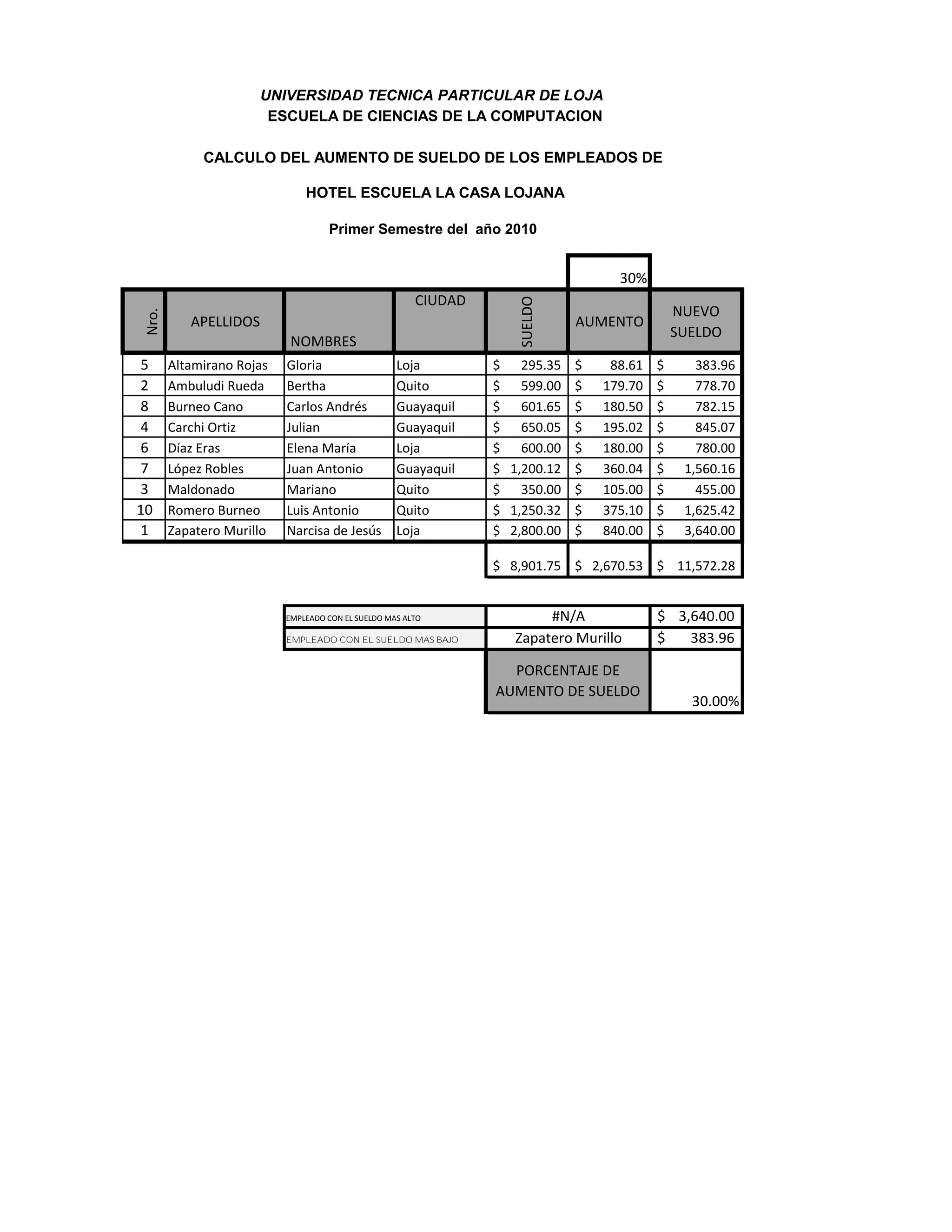 Este documento calcula los aumentos salariales de los empleados del Hotel Escuela La Casa Lojana. Se aumentó los sueldos de todos los empleados en un 30%. El empleado con el sueldo más alto era Narcisa de Jesús Zapatero Murillo con $3,640 y el más bajo era Gloria Altamirano Rojas con $383.96. El porcentaje total de aumento de sueldo para todos los empleados fue de 30%.
