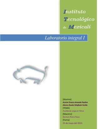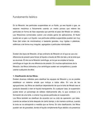 Este documento presenta información sobre filtros y la pérdida de carga en filtros. Explica los fundamentos teóricos de la filtración y clasifica diferentes tipos de filtros como lechos de filtración, filtros prensa de placas y marcos, filtros de hojas y filtros rotatorios continuos. También describe el diseño de una práctica de laboratorio para medir la pérdida de carga en un filtro y presenta resultados experimentales y teóricos.