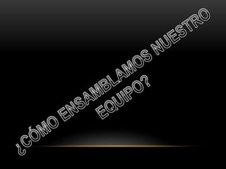 Este documento describe el proceso de ensamble y desensamble de un equipo de computo llevado a cabo por un grupo de estudiantes. Siguieron las instrucciones de su asesor y el manual de usuario para ensamblar primero la motherboard, colocar el disco duro y unidad óptica con cuidado, y luego conectar los cables. Para desensamblarlo guardaron cada componente por separado desconectando cables y retirando piezas como la motherboard y disco duro con cuidado.
