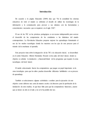Este documento describe un proyecto para integrar las TIC en la educación inicial en el Centro Educativo Alberto Hernández Rosario. El proyecto busca solicitar la instalación y funcionabilidad de los programas necesarios para la zona tecnológica del nivel inicial, la cual cuenta con computadoras pero no ha podido ser utilizada debido a que no tiene internet ni los programas instalados. El objetivo es motivar el uso de la tecnología en el aula inicial mediante actividades lúdicas de aprendizaje con las computadoras.