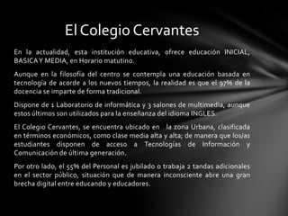 Este documento describe la propuesta de implementar una plataforma de aprendizaje virtual llamada Moodle en el Colegio Cervantes. Actualmente, el colegio ofrece educación inicial, básica y media de forma tradicional a pesar de su filosofía basada en la tecnología. La propuesta consiste en crear un ambiente de aprendizaje combinado en el aula y en línea utilizando recursos como laptops, smartphones e internet para fomentar un proceso de enseñanza-aprendizaje de calidad acorde a las tendencias modernas