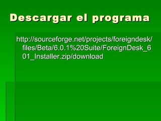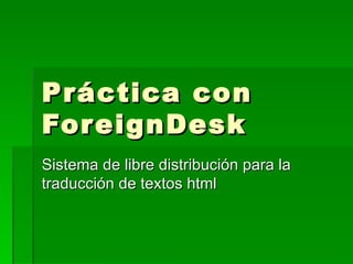 Este documento proporciona instrucciones para completar una práctica de traducción usando el programa ForeignDesk. Explica cómo crear un nuevo proyecto de traducción, agregar archivos originales, seleccionar el idioma de destino, y comenzar la traducción. También describe las carpetas y archivos creados por ForeignDesk y cómo usar las herramientas como coincidencias aproximadas para agilizar la traducción.