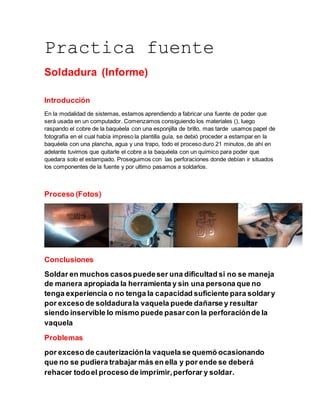 El documento describe el proceso de fabricación de una fuente de poder para un computador en un proyecto de sistemas. Los estudiantes raspan el cobre de una placa de circuito impreso, imprimen un diseño guía, perforan agujeros para los componentes y los soldan en su lugar. La conclusión advierte que la soldadura requiere experiencia para evitar dañar la placa, mientras que los problemas incluyen quemar demasiado la placa durante la soldadura, lo que requiere reiniciar el proceso completo.