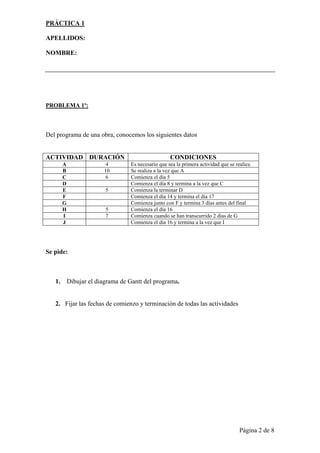 Este documento presenta 5 problemas relacionados con diagramas de Gantt para la planificación de obras. El primer problema proporciona datos sobre las actividades, duraciones y condiciones de una obra y pide dibujar el diagrama de Gantt correspondiente. El segundo problema sigue el mismo formato para otra obra. Los problemas 3 y 4 piden completar diagramas de Gantt y cuadros de planificación para obras más complejas. Finalmente, el problema 5 añade detalles al problema 4 para completar un cuadro de suministros y esquemas del proyecto