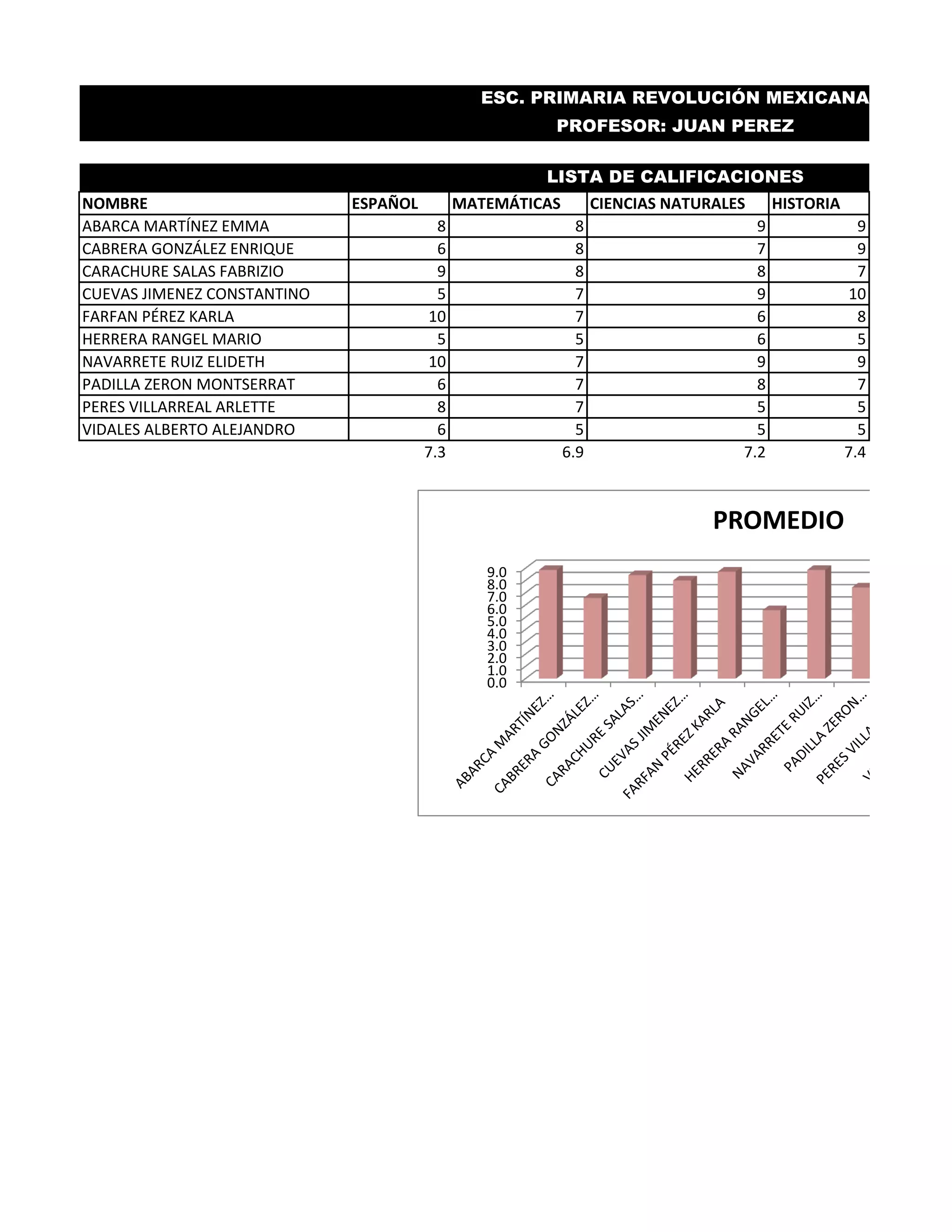El documento presenta las calificaciones de 10 estudiantes en varias materias. Muestra los nombres de los estudiantes, sus calificaciones en español, matemáticas, ciencias naturales e historia, así como los promedios generales de cada materia y del grupo.