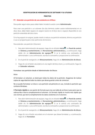 El documento proporciona instrucciones sobre cómo extender una partición existente, formatear una partición y comprobar si hay errores en el disco duro utilizando las herramientas Administración de equipos y Administración de discos en Windows. También explica cómo desfragmentar un disco duro con el Desfragmentador de disco y liberar espacio de almacenamiento con el Liberador de espacio en disco eliminando archivos temporales e innecesarios. Además, resume la función del Centro de actividades para ver alertas y realizar tareas de manten