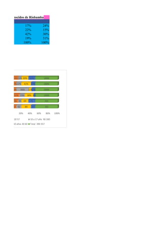 El documento presenta una tabla con el número de personas de cuatro barrios conocidos de Riobamba segregados por grupos de edad. Muestra que el barrio Pucara tiene un total de 390 personas, con un 31% entre 1 a 9 años y un 38% entre 18 a 60 años. El barrio Primavera tiene un total de 357 personas, con un 56% entre 10 a 17 años y un 11% entre 18 a 60 años.
