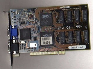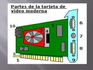 Este documento describe la evolución de las tarjetas de video desde los años 1960 hasta la década de 1990. Comenzó con tarjetas monocromáticas que mostraban solo texto, luego llegaron las tarjetas en color en 1981. Más adelante, se introdujeron tarjetas con mayores capacidades gráficas y de resolución como EGA en 1985. Finalmente, las tarjetas 3D como Voodoo se hicieron populares en la década de 1990 aunque requerían de una tarjeta 2D adicional.