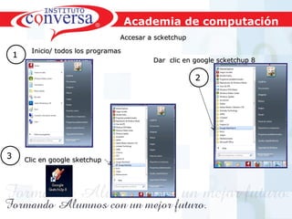 El documento proporciona instrucciones paso a paso para crear el logotipo de Google utilizando la herramienta SketchUp. Explica cómo dibujar cada letra del logotipo usando herramientas como lápiz, círculo, arco y copiar/pegar, y cómo dar volumen y girar las letras al final. El objetivo es crear el logotipo de Google solo con herramientas básicas en SketchUp.