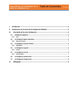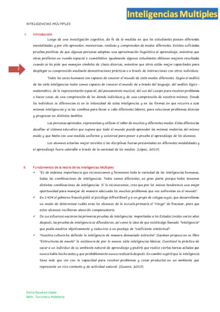 Este documento resume la teoría de las inteligencias múltiples de Howard Gardner, la cual propone que los seres humanos tienen siete tipos principales de inteligencia: lingüística, lógico-matemática, corporal-kinestésica, espacial, musical, interpersonal e intrapersonal. Explica cada una de estas inteligencias y sus características. Además, discute los fundamentos de esta teoría y cómo reconoce la diversidad en las formas en que las personas aprenden y representan el conocimiento.