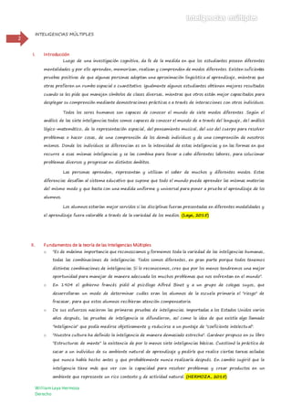 El documento describe la teoría de las inteligencias múltiples de Howard Gardner. Explica que según Gardner, los humanos tienen siete tipos principales de inteligencia: lingüística, lógico-matemática, corporal-kinestésica, espacial, musical, interpersonal e intrapersonal. Luego, el documento proporciona una breve descripción de cada tipo de inteligencia identificada por Gardner. Concluye que reconocer estas múltiples inteligencias es importante para mejorar la educación y el aprendizaje de los estudiantes