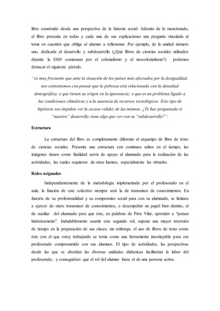 Este documento resume un libro de texto de ciencias sociales para 4o de la ESO. El libro presenta una perspectiva transgresora al centrarse en una temática de historia social con el pueblo como protagonista, en lugar de dinastías o batallas. Usa un lenguaje inclusivo y divulgativo, y plantea preguntas para estimular la reflexión. Su estructura se aleja del formato tradicional mediante saltos en el tiempo y el uso de imágenes y actividades. Su enfoque busca crear un vínculo entre el alumn