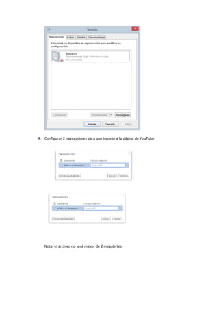 El documento proporciona instrucciones para completar una práctica uno sobre el panel de control, incluyendo desactivar el firewall y Windows Defender, desactivar la tarjeta de sonido, y configurar dos navegadores para acceder a YouTube. Capturas de pantalla deben tomarse para evidenciar el trabajo realizado.