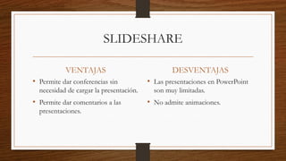 SlideShare es un sitio web que permite a los usuarios subir y compartir presentaciones de diapositivas en formatos como PowerPoint, PDF y OpenOffice. Los usuarios pueden dar conferencias en línea sin necesidad de cargar la presentación completa y pueden dar comentarios a las presentaciones de otros. Para crear una cuenta, los usuarios completan un proceso de registro en el que proporcionan información personal y confirman su correo electrónico.
