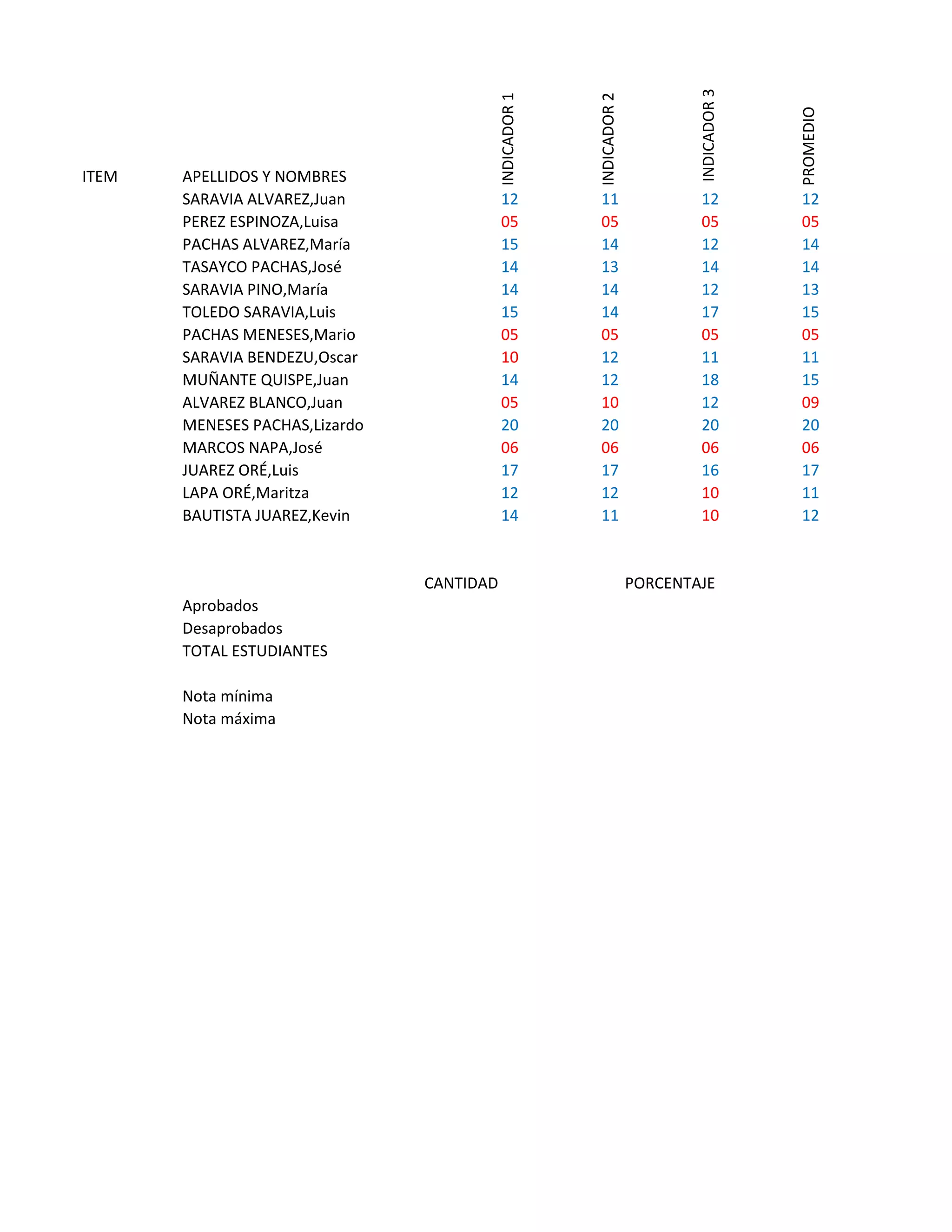 Este documento presenta los resultados de 14 estudiantes en 3 indicadores clave y su promedio general. Muestra los apellidos y nombres de cada estudiante junto con sus puntajes en cada indicador y promedio. Adicionalmente, incluye estadísticas como la cantidad y porcentaje de estudiantes aprobados y desaprobados, las notas mínima y máxima, y una sección de observaciones.