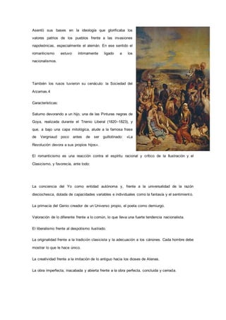 El documento describe el contexto histórico y social del Romanticismo. Se originó a finales del siglo XVIII en Alemania y el Reino Unido como una reacción contra la Ilustración, dando prioridad a los sentimientos. Se extendió por Europa en la primera mitad del siglo XIX e influyó en la literatura, pintura y música a través de temas como la naturaleza, la libertad individual y el nacionalismo.