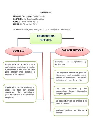 Este documento describe la competencia perfecta y sus características clave. Resume que en una competencia perfecta, existen muchos compradores y vendedores que interactúan en el mercado para productos homogéneos. Los precios son determinados por el mercado y no pueden ser manipulados por ninguna empresa. Además, tanto los compradores como los vendedores tienen acceso completo y gratuito a la información, y no hay barreras para entrar o salir del mercado.