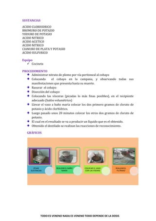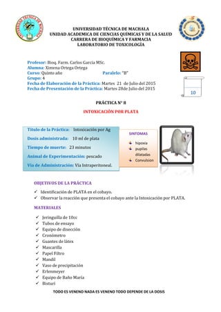 Este documento describe un experimento en el que se administró plata a un pescado por vía intraperitoneal para observar los efectos de la intoxicación por plata. El pescado murió 23 minutos después de la administración de 10 ml de plata. El documento detalla los objetivos, materiales, procedimiento, síntomas observados y conclusiones del experimento.