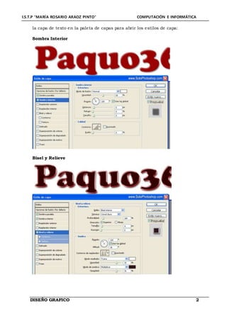 El documento describe diferentes efectos de texto que se pueden aplicar en Photoshop, incluyendo sombras, bisel, relieve, contorno y textura. Explica cómo aplicar estos estilos a capas de texto y muestra ejemplos de texto con efectos de plástico, metal, y oro aplicando diferentes parámetros en las capas.