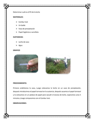 Este informe de laboratorio describe un experimento para determinar el pH de la leche. Se ordeñó una vaca y se midió el pH de la leche utilizando papel tornasol y un medidor de pH. Los resultados mostraron que la leche tiene un pH ligeramente ácido. El informe también incluye recomendaciones de seguridad para futuros experimentos de laboratorio.