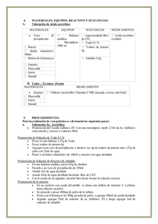 Este documento presenta los resultados de una práctica de laboratorio para evaluar la calidad de una forma farmacéutica que contenga ácido ascórbico como principio activo. Se realizaron pruebas de valoración del ácido ascórbico, color, textura y forma de tabletas, desintegración y friabilidad de tabletas masticables y efervescentes. Los resultados mostraron que el contenido de ácido ascórbico estaba dentro de los límites establecidos y que las tabletas cumplían con los requisitos de color, forma, textura, des