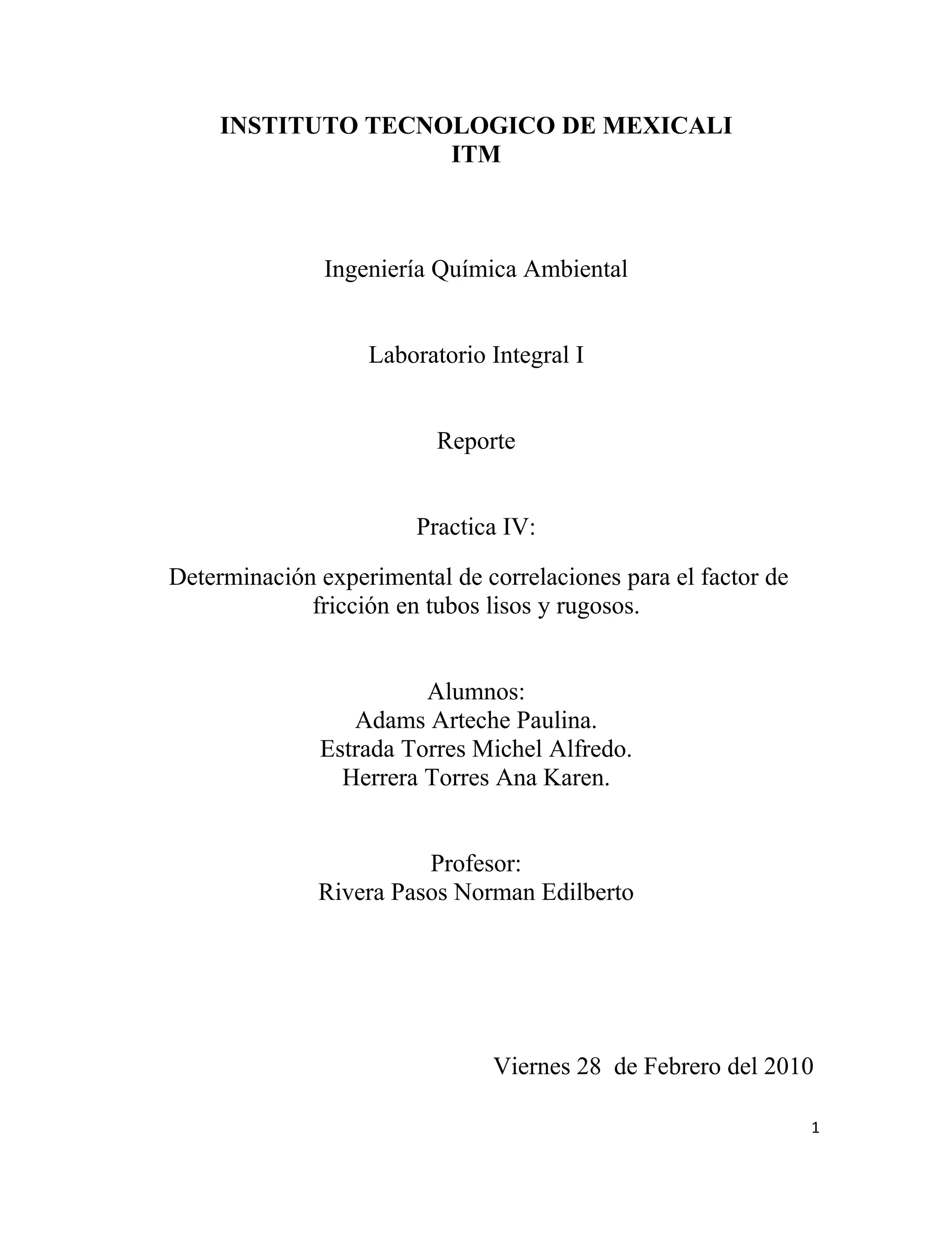 Este reporte describe una práctica de laboratorio realizada para determinar experimentalmente correlaciones para el factor de fricción en tubos lisos y rugosos. Los estudiantes midieron el flujo volumétrico y la variación de presiones a través de tubos de cobre, galvanizado y PVC. Calculando el número de Reynolds, determinaron el régimen de flujo y usaron ecuaciones para calcular valores teóricos y experimentales del factor de fricción. Concluyeron que el factor de fricción influye en el flujo a través de tuberías y que los valores