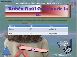 El documento presenta información sobre dos estudiantes, Ruben Ornelas de la O en el salón 109 en el turno matutino y Uriel en el salón 157 en el turno vespertino.