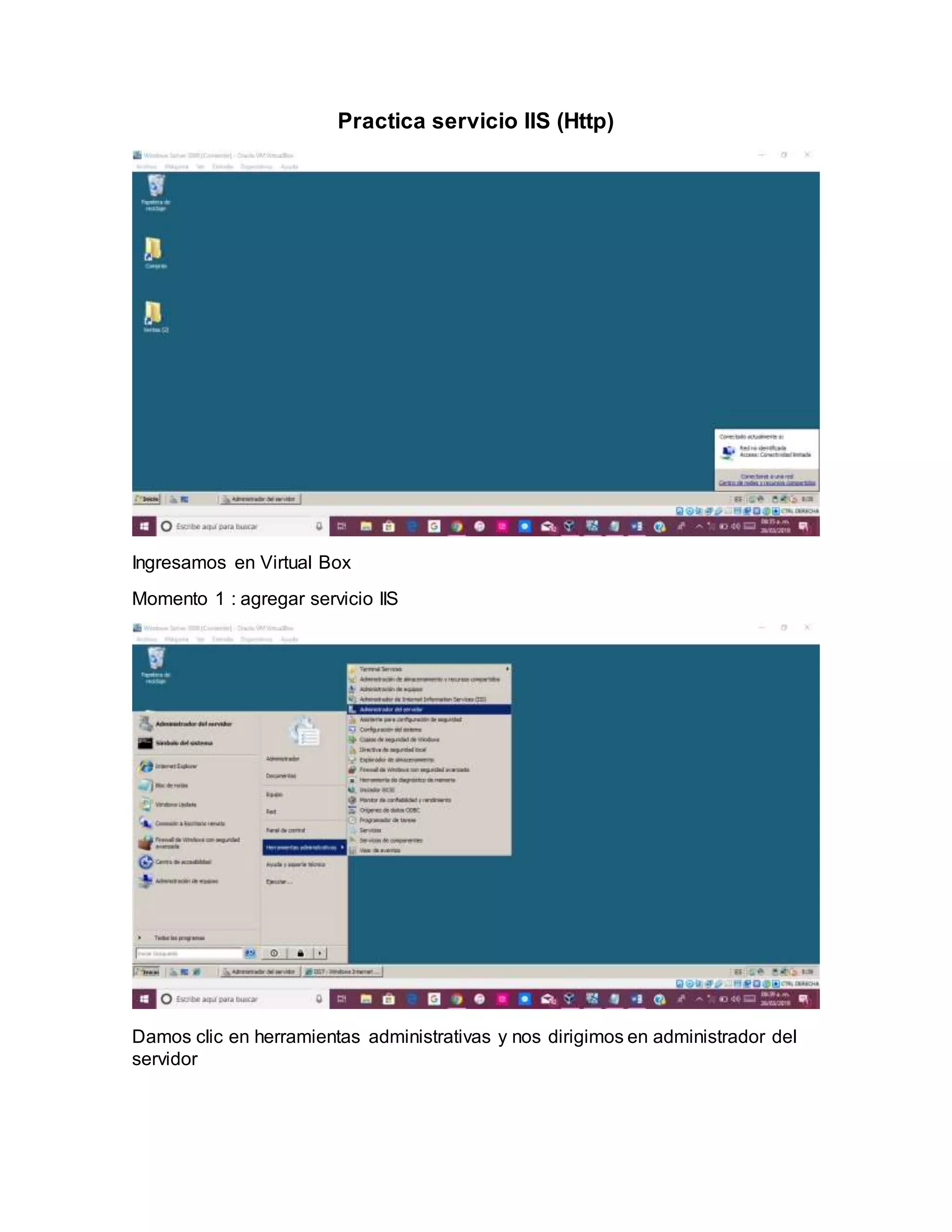 El documento describe los pasos para practicar el servicio IIS (Http) en Virtual Box: 1) agregar el servicio IIS en el administrador de servidor, 2) instalar el servidor web IIS y ver sus características, 3) crear un sitio web básico en IIS7.
