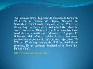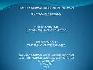 Este documento presenta un informe de práctica pedagógica realizado por Daniel Martínez Galeano para Zigifredo Ortiz Sánchez en la Escuela Normal Superior de Popayán durante el tercer semestre de 2011. Brevemente describe la historia de la fundación de la Escuela Normal Superior de Popayán en 1934 y su traslado a esta ciudad en 1935, así como la celebración de la Novena de Navidad con el grado cuarto A.
