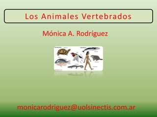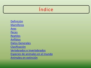Este documento resume las características de los cinco grupos principales de animales vertebrados: mamíferos, aves, peces, reptiles y anfibios. Describe sus rasgos distintivos como la cobertura corporal, la respiración, las extremidades y el hábitat típico. También incluye tablas comparativas de sus características y clasificaciones generales de animales vertebrados e invertebrados.