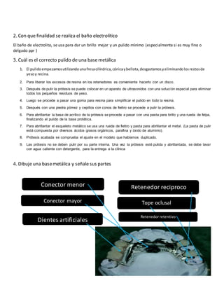 Este documento describe los pasos para pulir una base metálica protésica. Explica que se debe enmuflar la prótesis con yeso dentro de la mufla, dejando libres los dientes y cera, y luego aplicar un separador antes de vaciar la contramufla. También cubre el uso del baño electrolítico para pulir y dar brillo a la base metálica, y los pasos de pulido con distintas herramientas como fresas, piedra pómez y pasta de pulir metal.