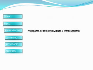 El documento habla sobre el emprendimiento y el empresarismo. Define el emprendimiento como la etapa de potenciación de la persona para superar dificultades, establecer objetivos y generar valor e ideas de negocio. Define el empresarismo como la etapa posterior que implica la creación de empresas a partir de planes de negocio para contribuir al tejido empresarial. Incluye actividades como escuchar un video, participar en un foro y visitar páginas web sobre emprendimiento.