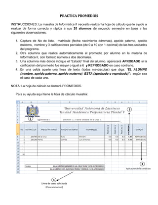 El documento proporciona instrucciones para crear una hoja de cálculo que ayude a una maestra a evaluar y calificar a 20 estudiantes de manera rápida y efectiva. La hoja de cálculo debe incluir columnas para los datos de los estudiantes, sus calificaciones parciales, el promedio automático de cada estudiante, su estado de aprobado o reprobado, y una línea de texto con el nombre completo del estudiante y su estado.