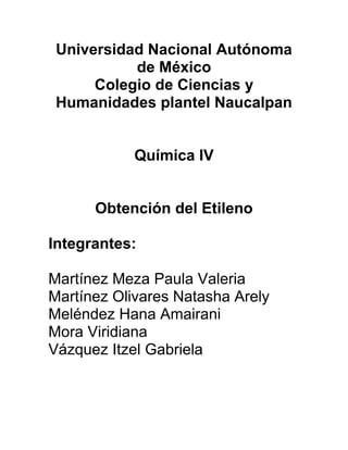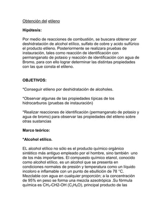 Este documento describe un experimento para obtener etileno a través de la deshidratación de alcohol etílico usando ácido sulfúrico y sulfato de cobre como catalizador. El procedimiento involucra calentar estas sustancias y luego realizar pruebas de identificación como reacciones con permanganato de potasio y agua de bromo que cambian de color. Los estudiantes fueron capaces de obtener etileno y observar el cambio de color morado a transparente con permanganato de potasio, aunque no pudieron ver completamente el