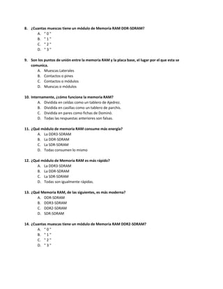 La memoria RAM es un tipo de memoria volátil que pierde su información al apagarse la computadora. Existen diferencias físicas entre los módulos DDR y DDR3, como el número de pines y la posición de la muesca. La memoria RAM se encuentra dentro del microprocesador y almacena los programas ejecutados temporalmente. Los módulos se conectan en los zócalos de memoria de la placa base.
