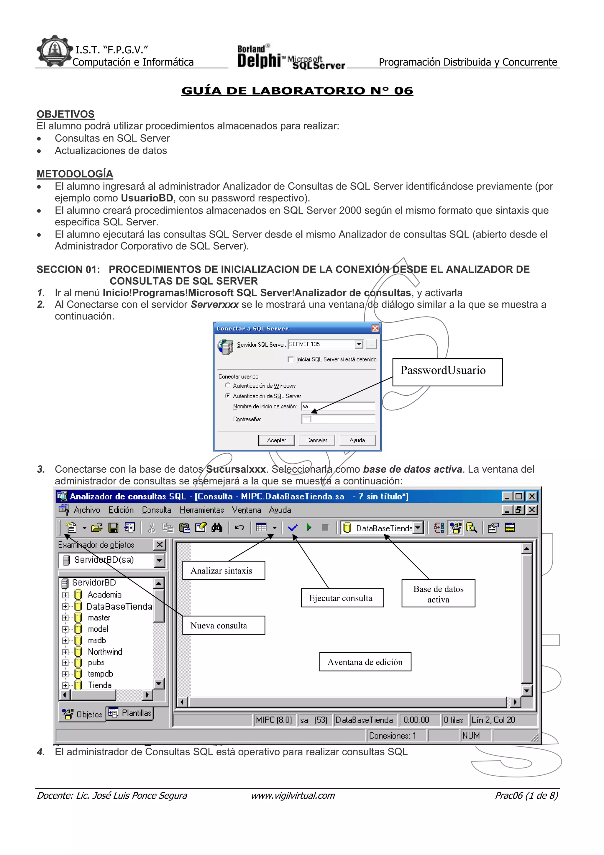 Este documento presenta las instrucciones para crear varios procedimientos almacenados y una vista en SQL Server para realizar consultas y actualizaciones de datos. Se explican los pasos para crear procedimientos para buscar empleados, obtener estadísticas de pedidos por producto y cliente, y leer datos de tablas usando cursores. También se crea una vista para unir datos de proveedores, clientes y empleados.