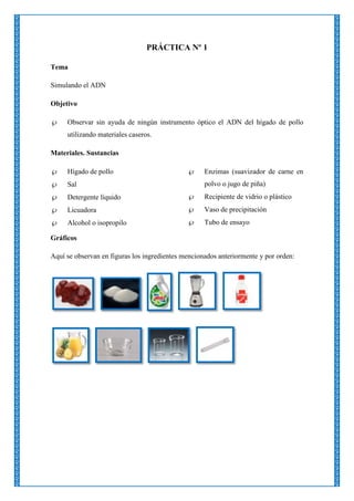 Este documento describe un experimento para simular el ADN utilizando materiales caseros como hígado de pollo, sal, detergente líquido, enzimas y alcohol. El procedimiento incluye cortar el hígado, licuarlo con sal, agregar detergente, enzimas y luego alcohol, lo que permite que los filamentos de ADN se separen y eleven en el alcohol. El objetivo es observar el ADN sin uso de instrumentos ópticos. Se logró ver vagamente algunos trozos pequeños de ADN. Se concluye que el experimento fue sencil