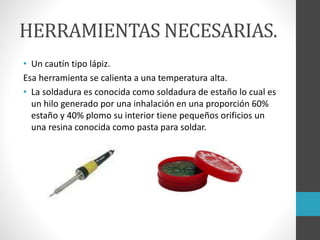 Este documento describe las herramientas y los pasos necesarios para realizar soldadura. Se requiere un cautín que se calienta a alta temperatura y soldadura de estaño-plomo. El proceso implica calentar el cautín para desoldar componentes, luego aplicar soldadura de estaño derretida para volver a unir los componentes en su lugar.
