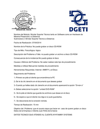 El documento describe los pasos para brindar soporte técnico remoto a un cliente que no podía grabar un archivo en un disco CD-ROM. Se le pidió al cliente que encienda la PC y se le guío a través de los pasos de hacer clic derecho en el archivo, seleccionar "Enviar a" y luego "unidad DVD-RAM" para grabar los archivos en el disco. El técnico esperó a que el cliente confirme que pudo guardar los archivos correctamente antes de finalizar la sesión de soporte remoto de 15 minutos.