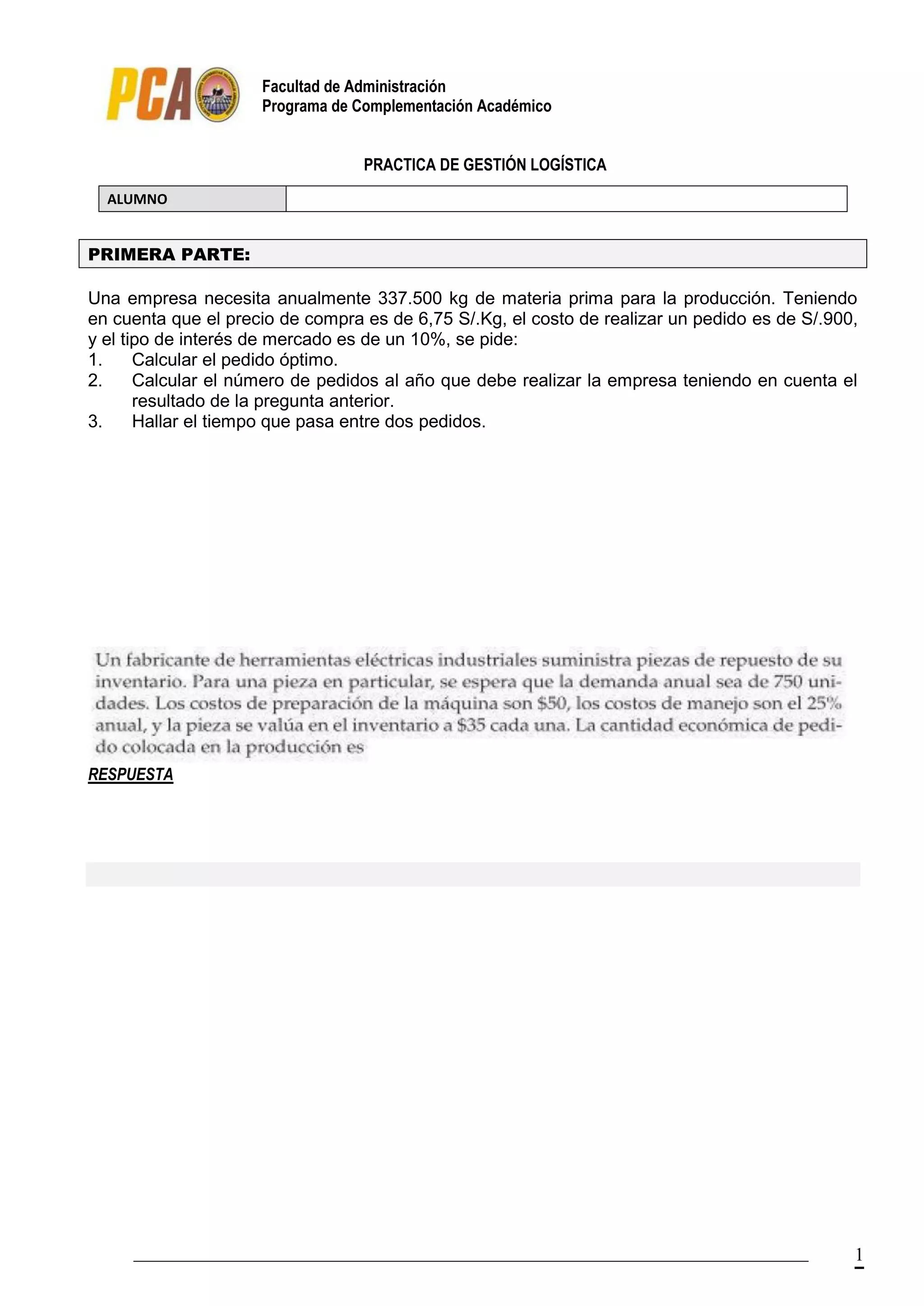 Este documento presenta un caso práctico de gestión logística para una empresa. En la primera parte, se pide calcular el pedido óptimo de materia prima, el número de pedidos anuales y el tiempo entre pedidos. En la segunda parte, se pide clasificar 10 artículos de inventario de una empresa fabricante de componentes eléctricos usando el método ABC basado en el valor monetario de cada artículo.
