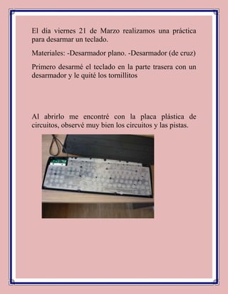 Los estudiantes realizaron una práctica para desarmar un teclado. Primero quitaron los tornillos de la parte trasera con un desarmador plano y encontraron la placa de circuitos. Luego levantaron la placa y observaron la membrana de goma que sirve como resorte al presionar las teclas. Finalmente volvieron a colocar la membrana y la placa de circuitos en el teclado.