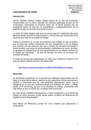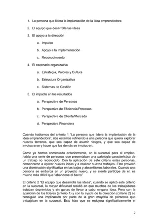 El documento describe cómo la aplicación del Marco de Referencia del Capital Humano Emprendedor ayudó a mejorar la situación de los funcionarios en una oficina de empleo que sufrían estrés y bajo rendimiento debido a la falta de reconocimiento. El marco fomentó el liderazgo, el trabajo en equipo, el apoyo de la dirección y valores compartidos, lo que resultó en menos ausencias, mayor satisfacción laboral, mejor servicio a los clientes y procesos más eficientes.