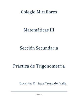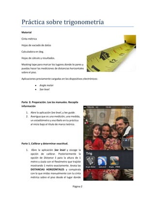 Este documento contiene las instrucciones para una práctica de trigonometría que incluye cuatro actividades: 1) calibrar y determinar la exactitud de una aplicación electrónica mediante mediciones, 2) medir distancias horizontales hasta un compañero, 3) calcular alturas inaccesibles usando distancias horizontales y ángulos de elevación, y 4) calcular la altura del colegio desde diferentes puntos. El documento proporciona tablas y rúbricas para registrar los resultados.