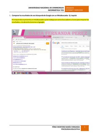 Este documento presenta las actividades realizadas por María Fernanda Pérez, estudiante de Psicología Educativa en la Universidad Nacional de Chimborazo, Ecuador, como parte de la asignatura Informática TIC. Las actividades incluyen búsquedas en Google y metabuscadores, visitas a sitios web de radios, cálculos de tiempos de descarga, verificación de direcciones IP y más, con el objetivo de explorar diversos servicios e Internet y su aplicación en educación.