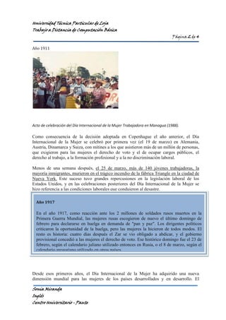 El Día Internacional de la Mujer se celebra el 8 de marzo para conmemorar la lucha de las mujeres por la igualdad. La idea surgió a finales del siglo XIX durante la revolución industrial y el movimiento obrero. En 1910, la Conferencia Internacional de Mujeres Socialistas proclamó el día como jornada de lucha por los derechos de las mujeres. Desde entonces, se ha celebrado para exigir mayores derechos y avances hacia la igualdad.