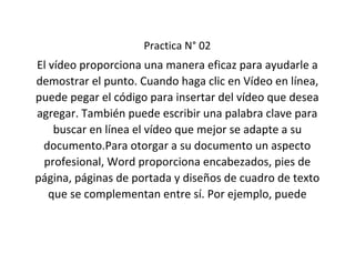 El documento describe las diferentes funciones de Microsoft Word que permiten agregar videos, imágenes y otros elementos para darle un aspecto profesional a un documento. Word ofrece encabezados, pies de página, portadas y diseños de texto que se complementan entre sí. Los temas y estilos ayudan a mantener la coordinación del documento y cambian los elementos para coincidir con el tema seleccionado.