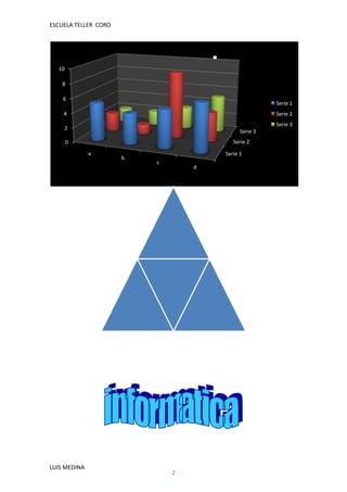 El documento presenta un gráfico de barras con 3 series que muestran datos numéricos para las letras a, b, c y d. También incluye el nombre de Luis Gerardo Medina y la escuela Teller Coro.