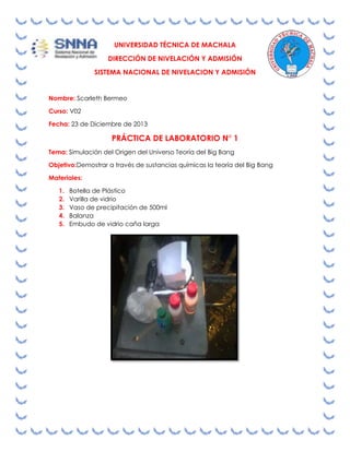 La práctica de laboratorio demostró la teoría del Big Bang al mezclar sustancias químicas en botellas de plástico que explotaron, simulando la expansión del universo desde una explosión inicial. Al mezclar y agitar las sustancias dentro de las botellas, estas estallaron y sus partículas se expandieron por el aire de forma similar a la explosión del Big Bang.