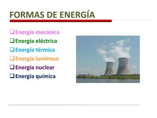 Este documento trata sobre las diferentes formas y fuentes de energía, incluyendo energía renovable y no renovable. Describe las principales fuentes renovables como solar, eólica, biomasa, y hidroeléctrica. También cubre el ciclo del vapor en las centrales eléctricas y las clasificaciones de las centrales hidroeléctricas. Finalmente, proporciona enlaces web sobre energía eléctrica.