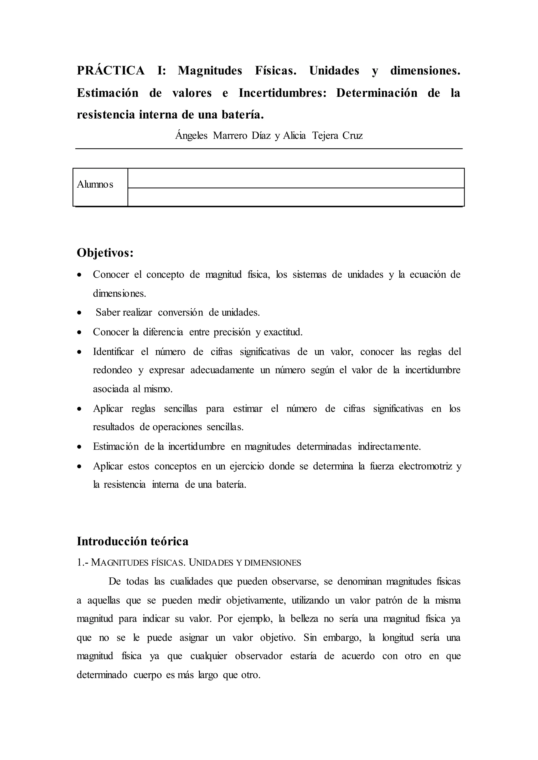 Este documento presenta los objetivos y contenido de una práctica sobre magnitudes físicas, unidades y dimensiones. Los objetivos incluyen conocer conceptos como magnitud física, unidades de medida, precisión y exactitud. La práctica introduce estas ideas y luego aplica los conceptos para determinar la fuerza electromotriz y resistencia interna de una batería.